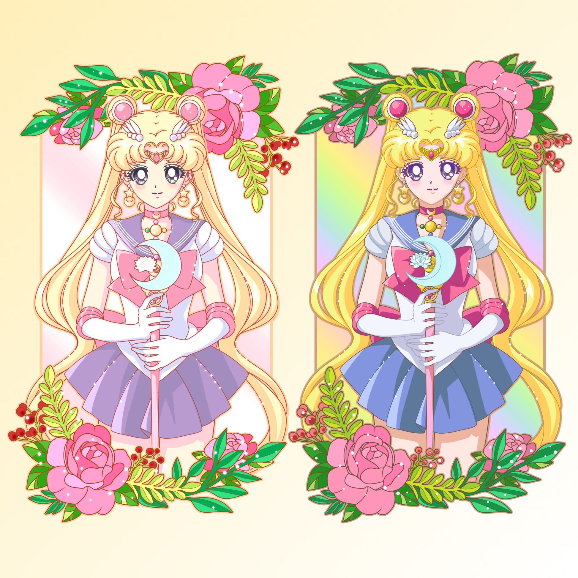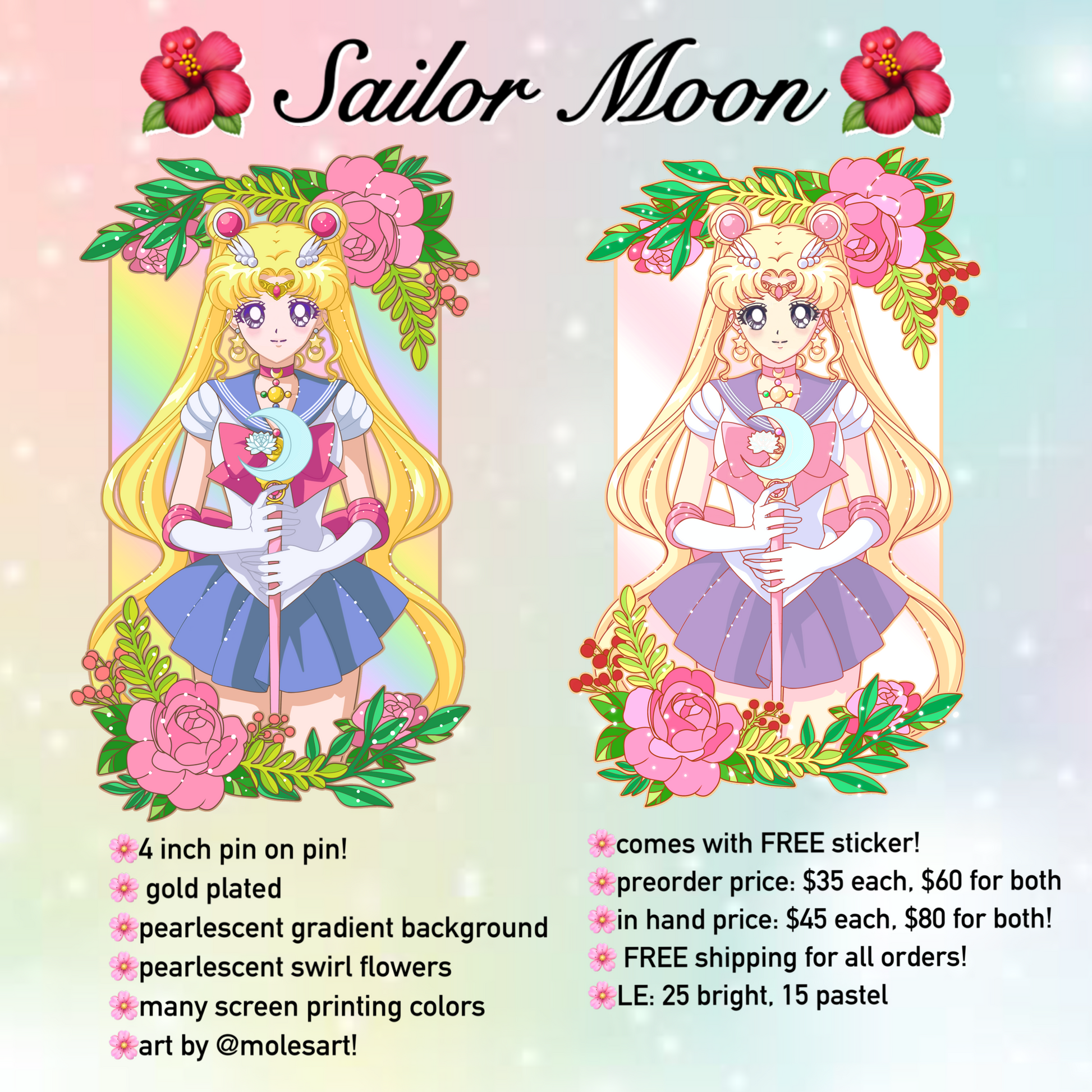 Featuring the beautiful Sailor Moon (Bright) and Sailor Moon (Pastel) variants! This will be a GIANT 4 inch pin on pin with many effects!! The preorder price will only be $35 for 1 and $60 for 2! (the reason for this is because I changed my mind to make it a pin on pin last minute and didn't want to screw over the people whom I told it would be this price for initially, so this will be the preorder price!) The in-hand price will be $45 for one variant and $80 for 2 variants!
