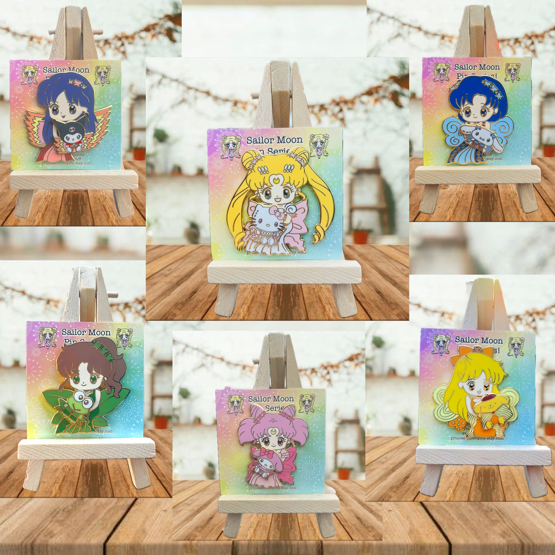 Featuring the Sailor Moon x Sanrio Spinning Enamel Pin Series!!! For any fans of Sailor Moon and/or Sanrio!! These are beautifully crafted with hard enamel metal and the character animal in the middle spins!!!! It's so fun I hope you guys love it!!